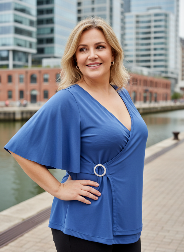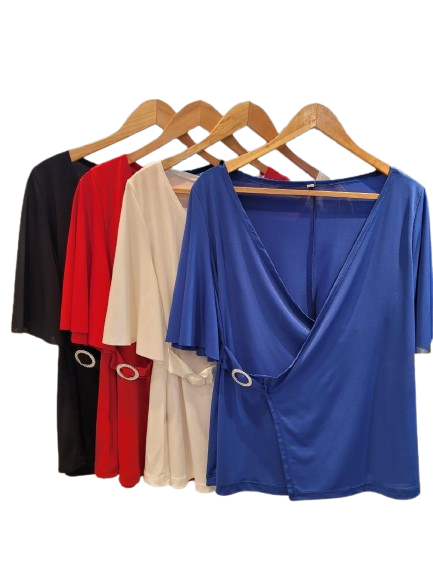 Remera cruzada con mangas anchas y detalle de aro brillante en el cruce.