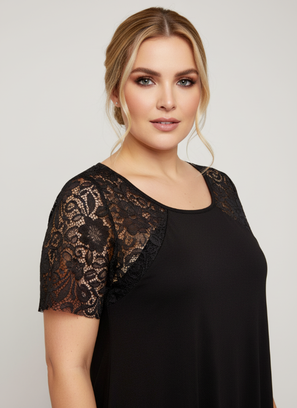 Vestido evasee en modal viscosa por la rodilla con detalle de mangas en encaje.