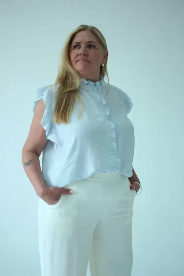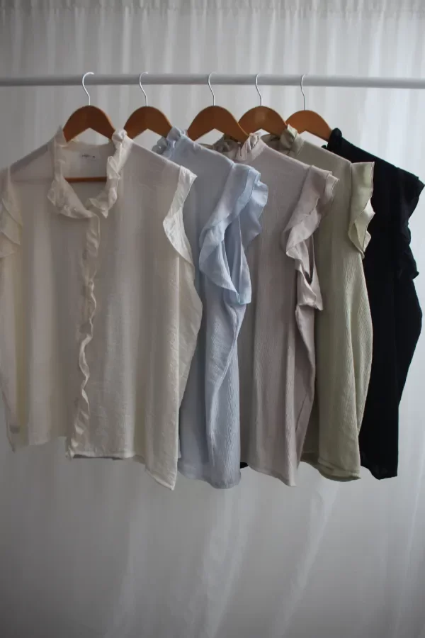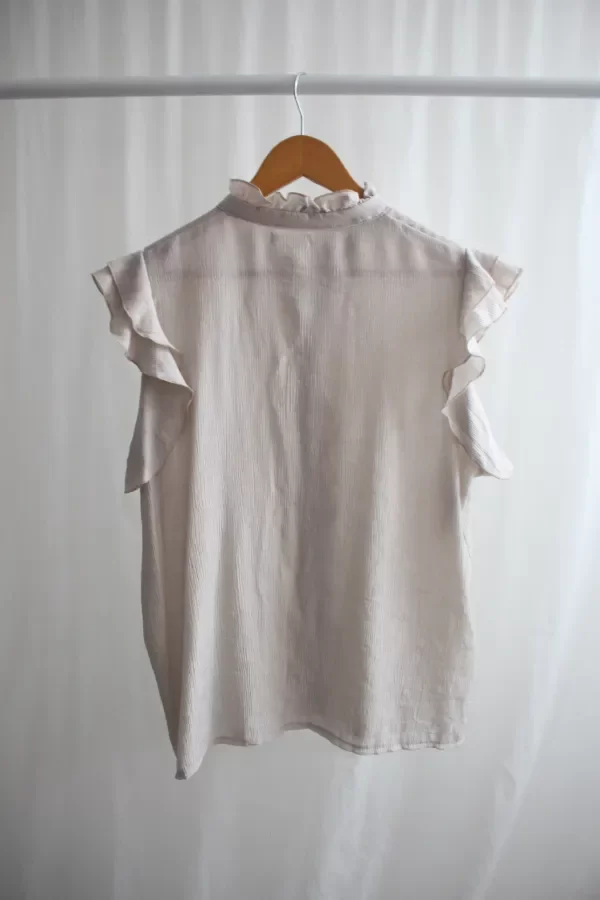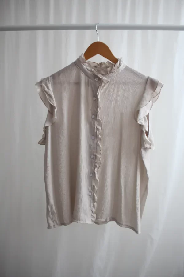 Descripcion: Blusa cuello alto con volados. Tiene volados en la cartera y en las mangas.