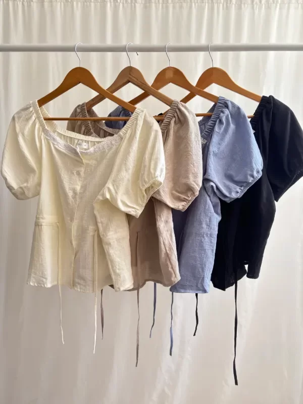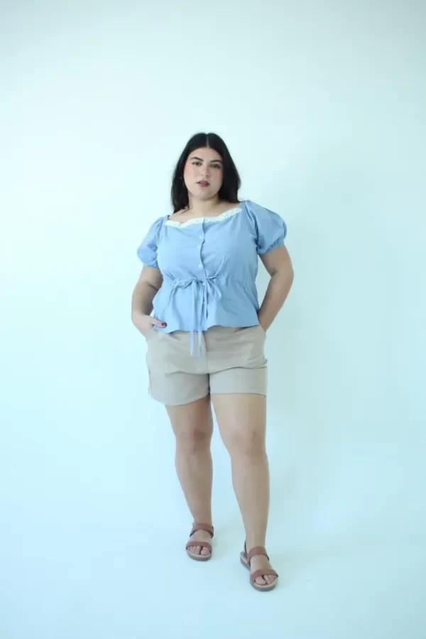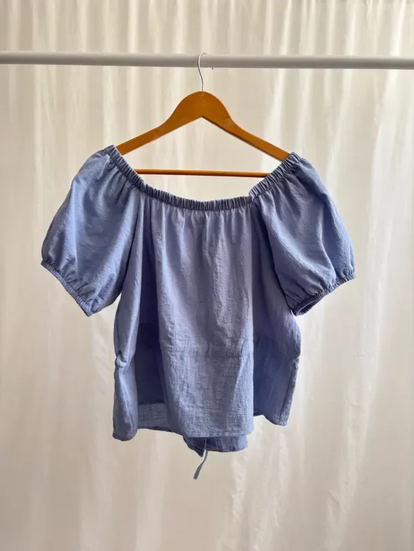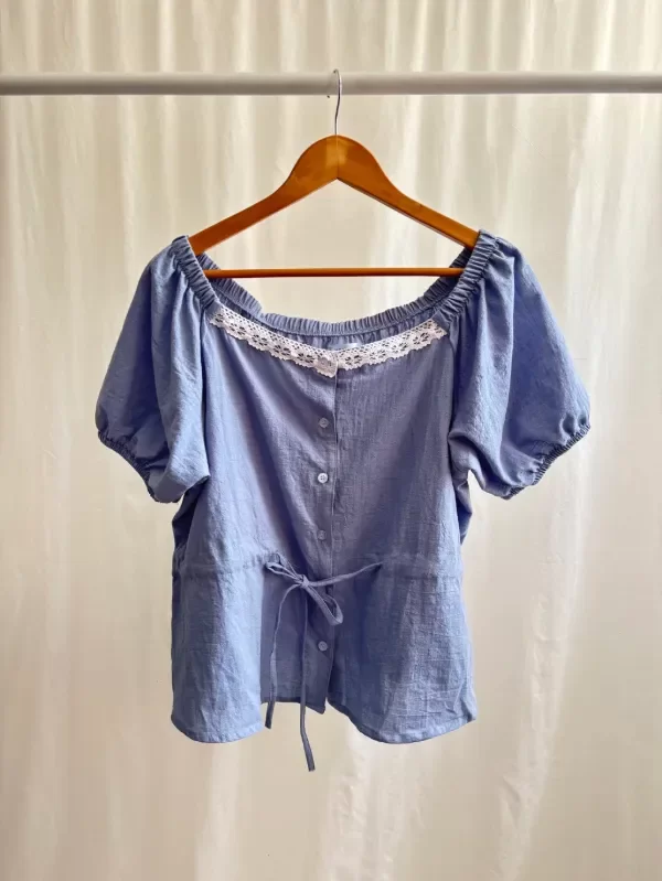 Descripcion: Blusa, escote bote cuadrado con puntilla y tira para ajustar en la cintura, y elastico en los puños, hombres y espalda