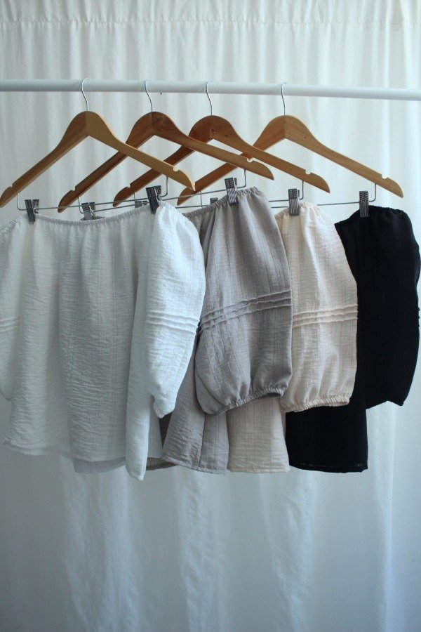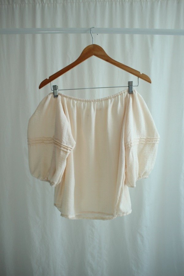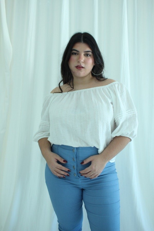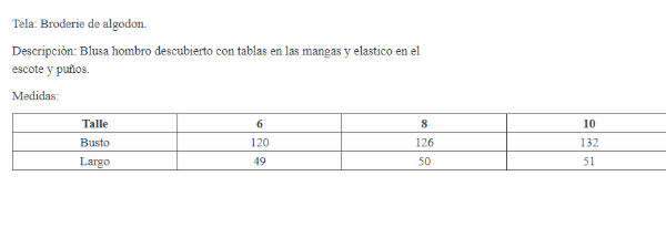 Descripciòn: Blusa hombro descubierto con tablas en las mangas y elastico en el escote y puños.