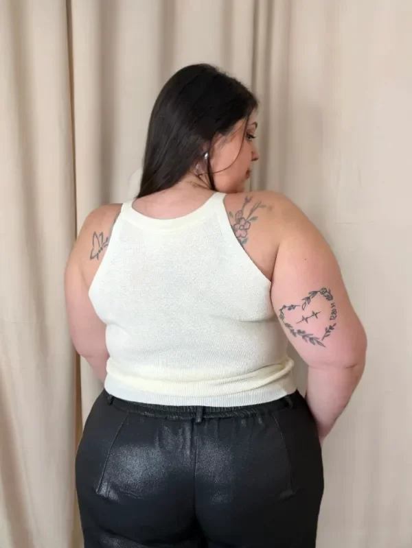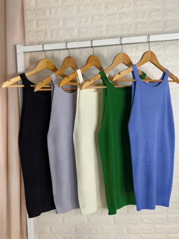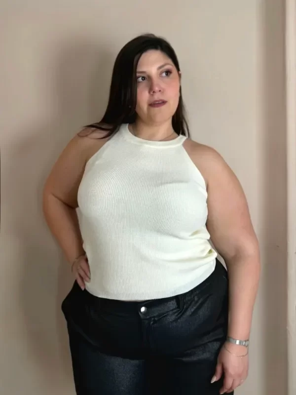 Musculosa (Vi-13), escote halter en acanalado tipo morley. Corte cómodo, ligeramente al cuerpo. Tejido en hilado muy liviano, de caída fresca y suave, ideal para el verano.
