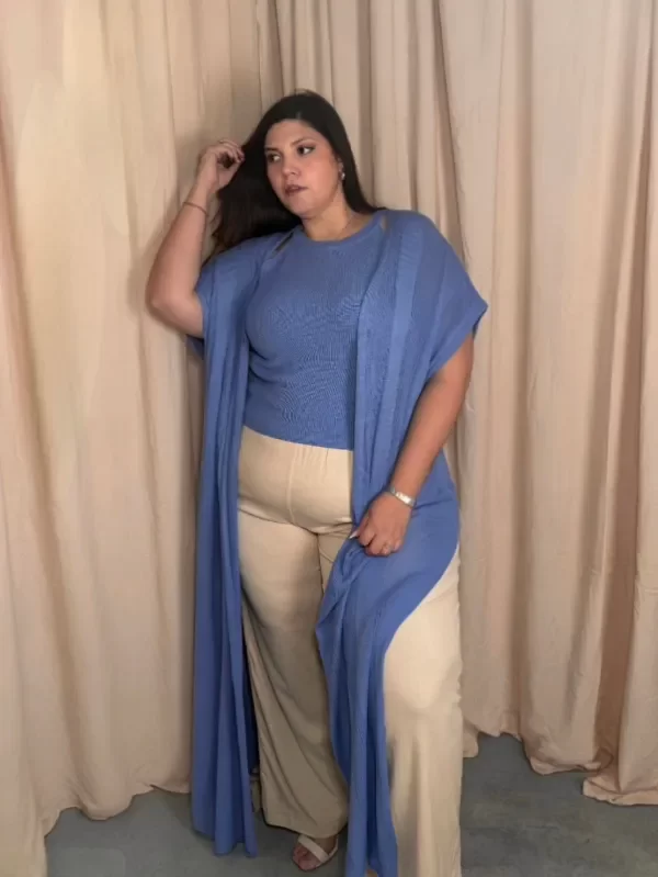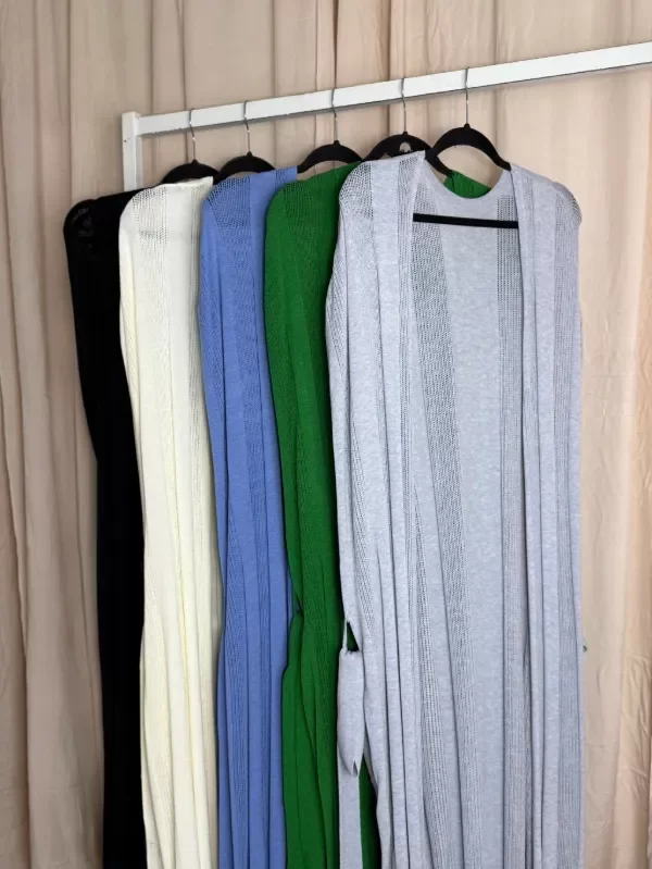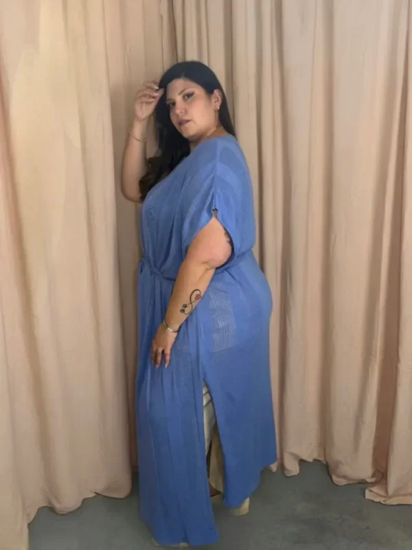 Kimono largo tejido con franjas acanaladas y caladas, con cinto a tono. Corte bien amplio con tajos laterales. Tejido en hilado muy liviano, de caída fresca y suave, ideal para días cálidos y verano.
