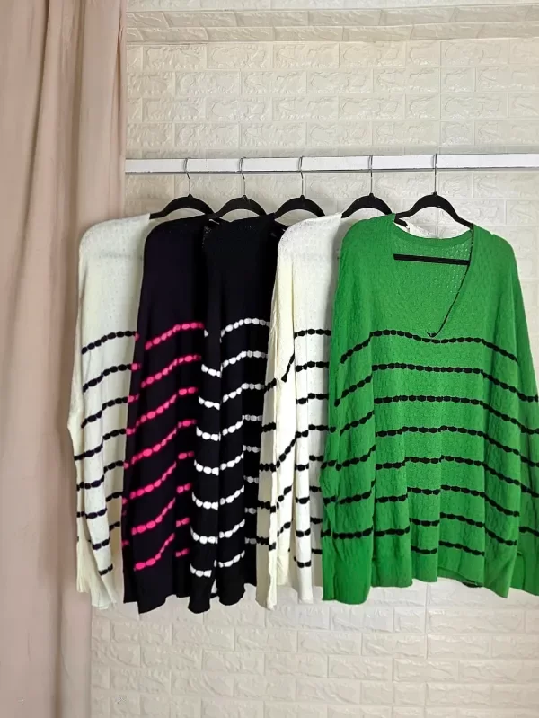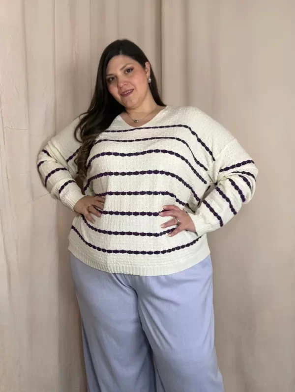 Sweater escote V y con rayas en relieve. Corte oversize, bien amplio y cómodo. Tejido en hilado muy liviano, de caída fresca y suave, ideal para días cálidos y verano.ㅤ